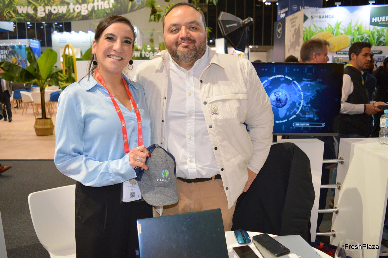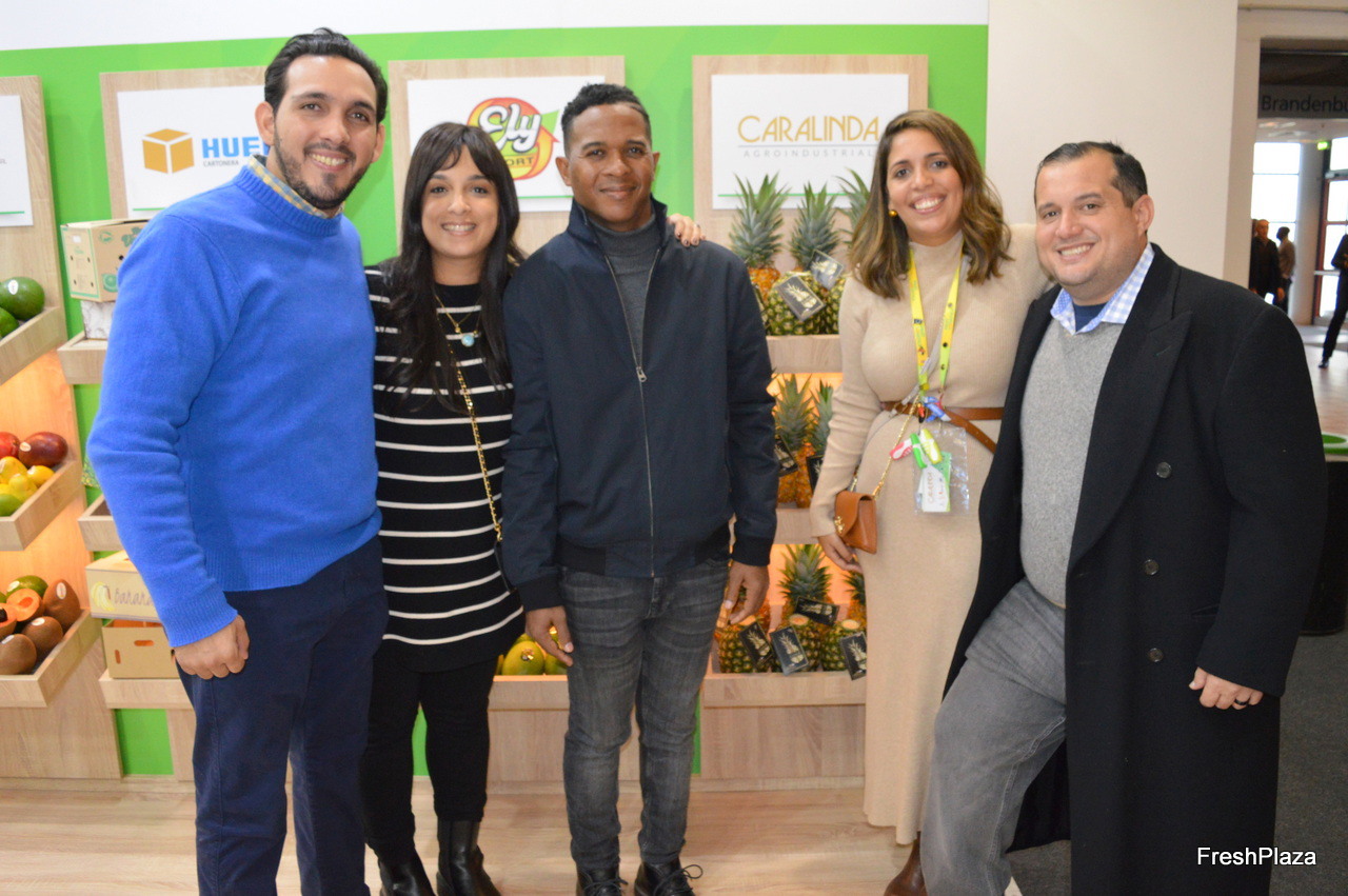 César Rodríguez y Kisha Rodríguez, propietarios de la exportadora de piña Caralinda en República Dominicana y miembros de su equipo dijeron que la feria es como antes del Covid, con buen interés de los compradores.