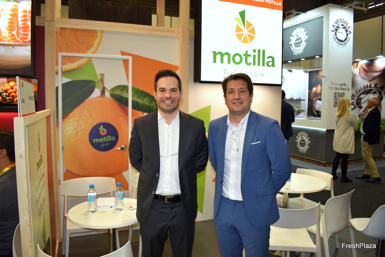 Juan Motilla y Nicolás Arbarello, en el stand de Motilla, productores y comercializadores de cítricos.