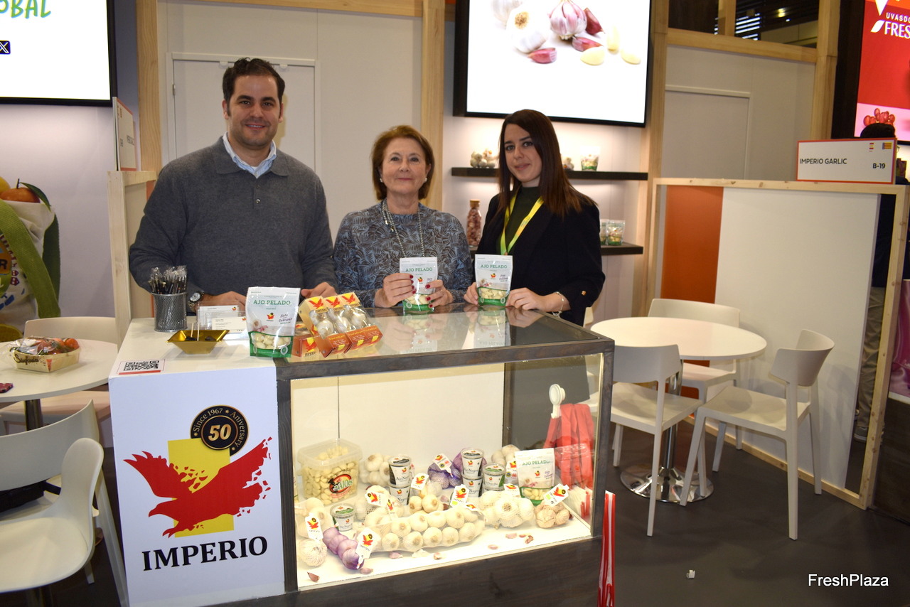 Carmen Roch, Borja Mira y Andrea Mas en el stand de Imperio, productores de ajo y cebolla.