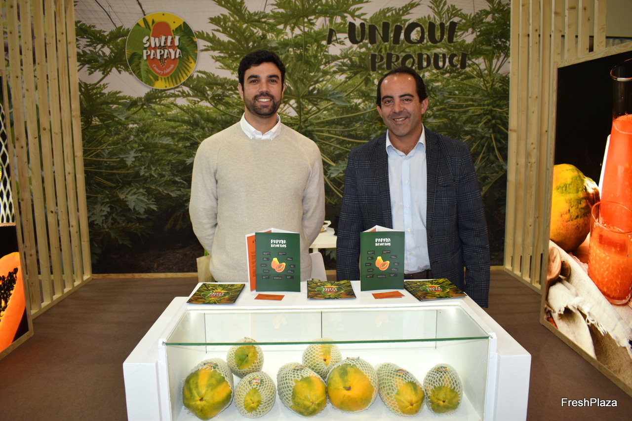 Eduardo Molina y Guillermo González, en el stand de Sweet Papaya, productores de papayas de Tenerife.