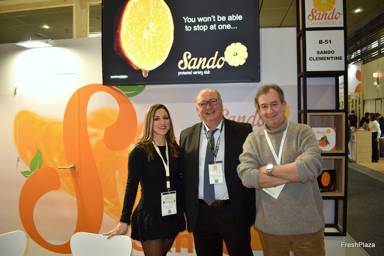 Eva Grífols, Joan Antoni Caballol y Luís Corral, en el stand de la clementina Sando.