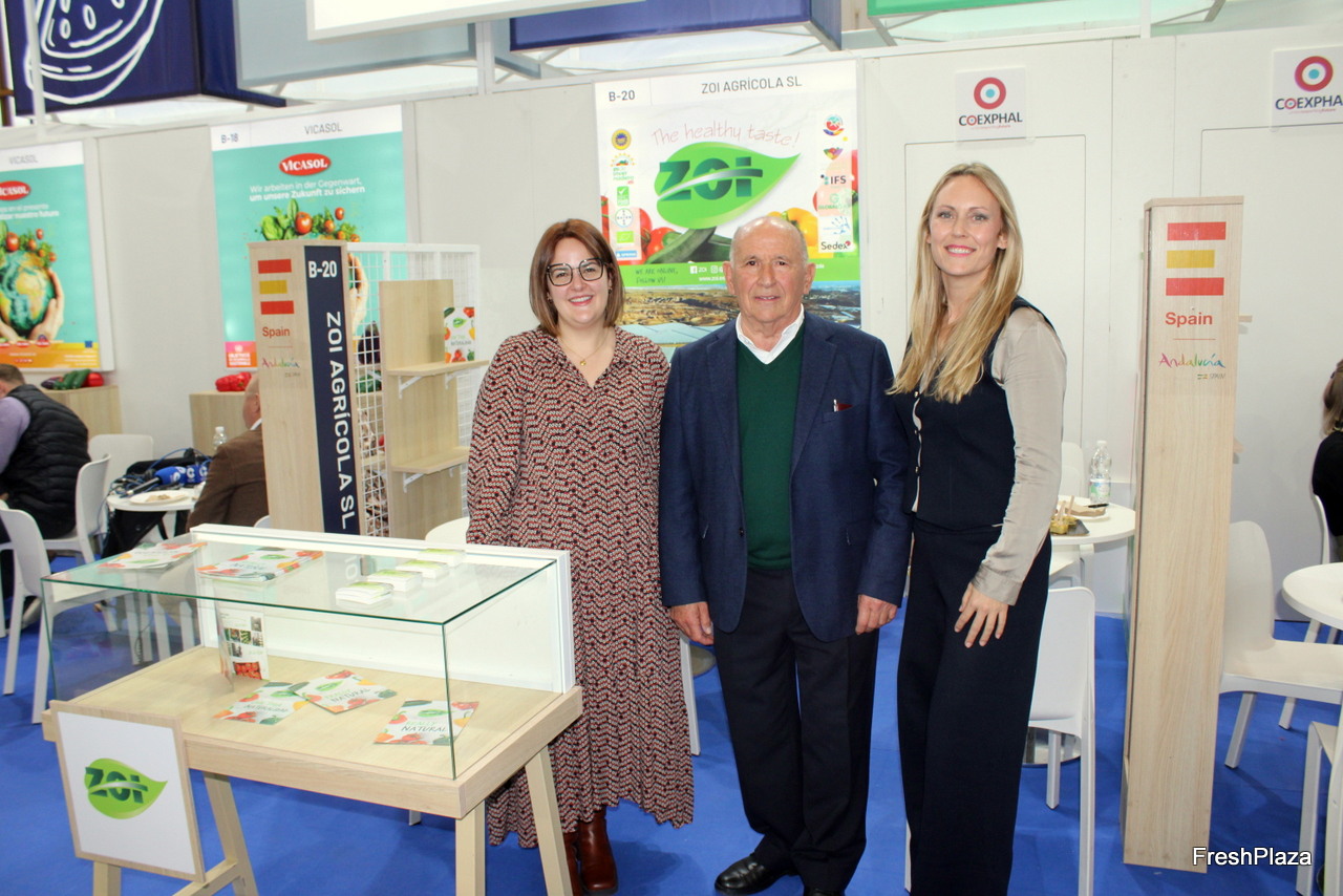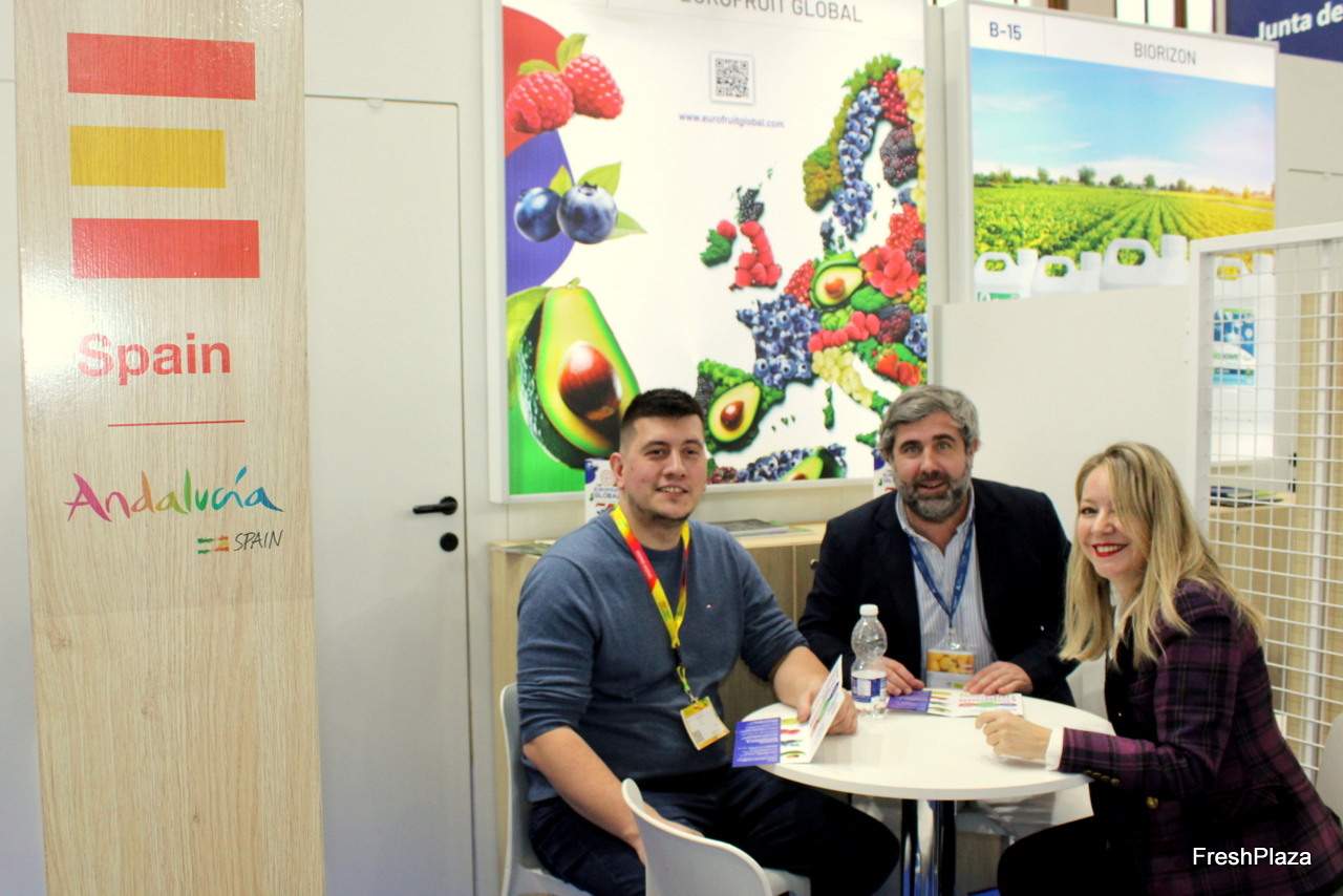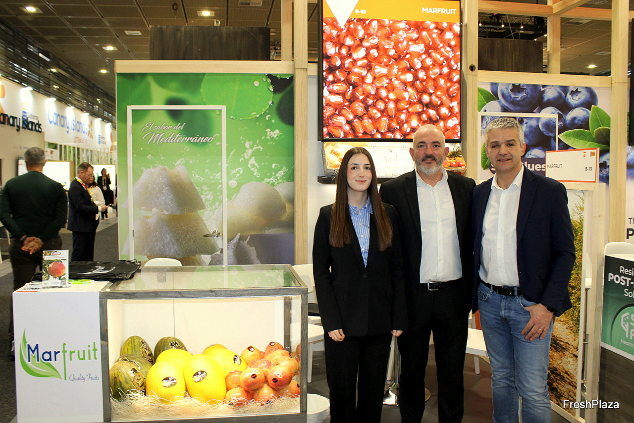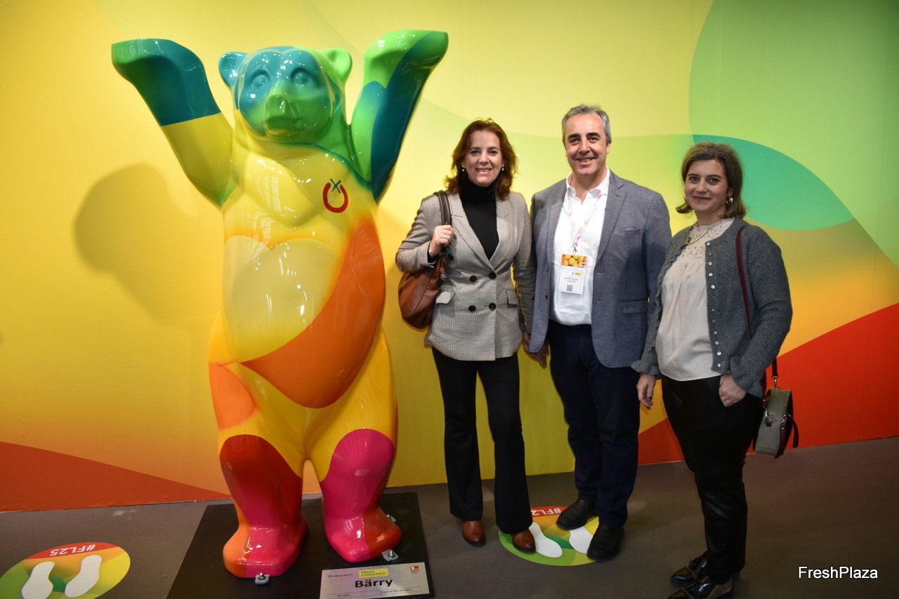 Abel Alarcón, Esther Egea y Rafa Monar, de la empresa valenciana Brio Fruits, visitando Fruit Logistica.