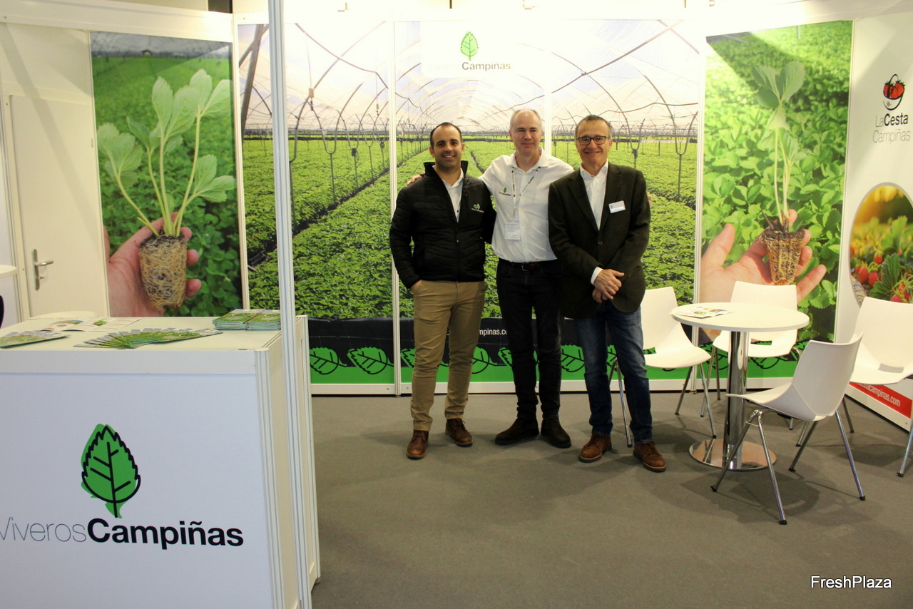 Antonio Martín y Carlos Herranz, de Viveros Campiñas, junto a Enrique Cardiñanos, de Bejo Ibérica. Viveros Campiñas, con sede en la localidad segoviana de Chañe, es especialista en la producción de planta de fresa, aunque también en la producción de fresa de verano entre mayo y noviembre