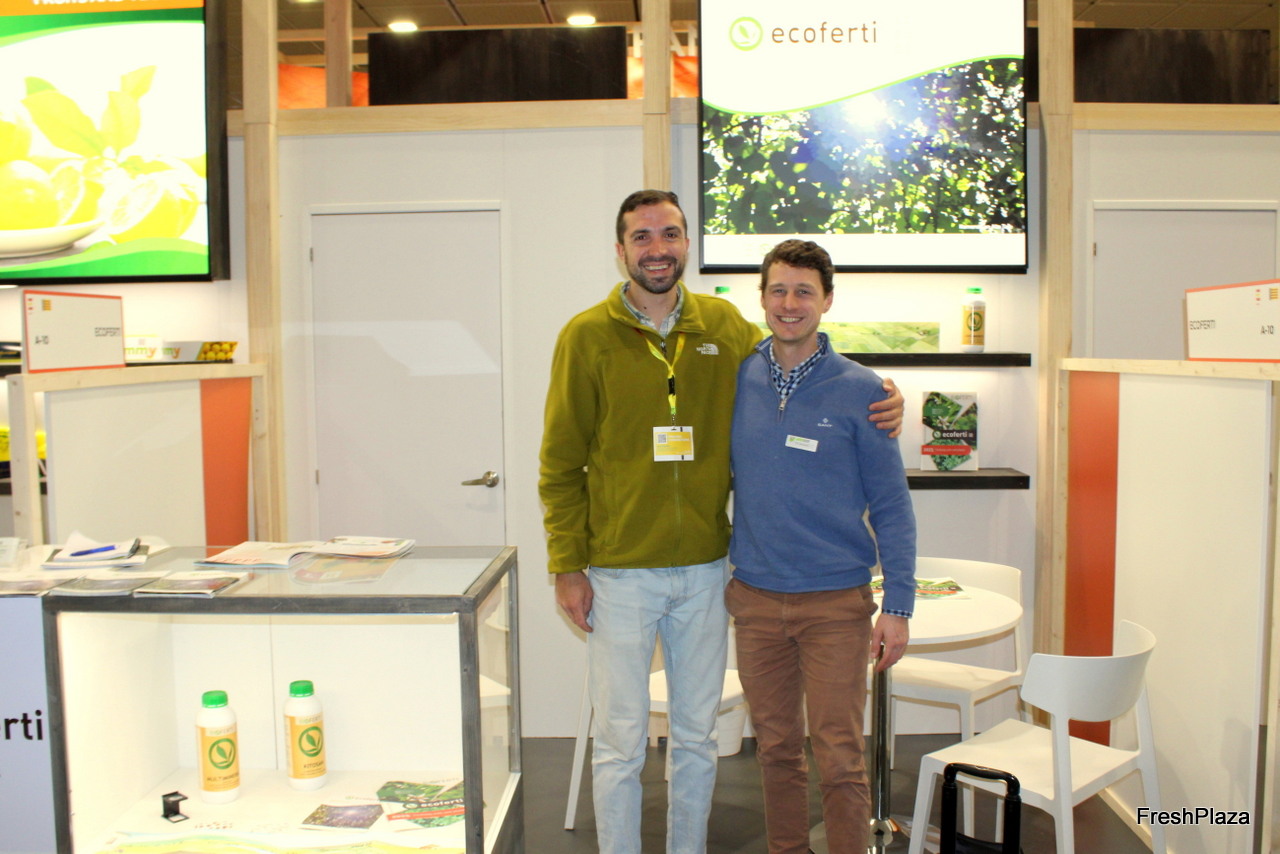 Juan Manuel Pozzoli, de Ecoferti, junto a Erik Akerboom, de Jadis Agri. Ecoferti llevó a la feria sus nuevos productos de biocontrol y regeneradores de suelos