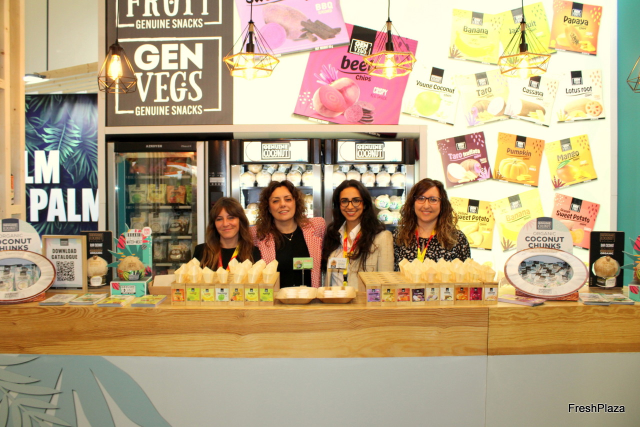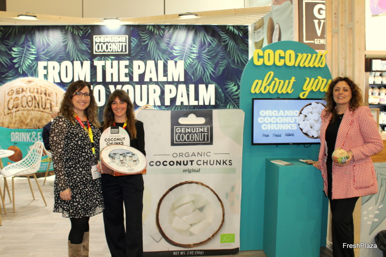 Míriam Días, Cristina Aliaga y Ana Molina, de Genuine Coconut, que volvió a traer a Berlín una edición más su gama de snacks de coco y frutas exóticas