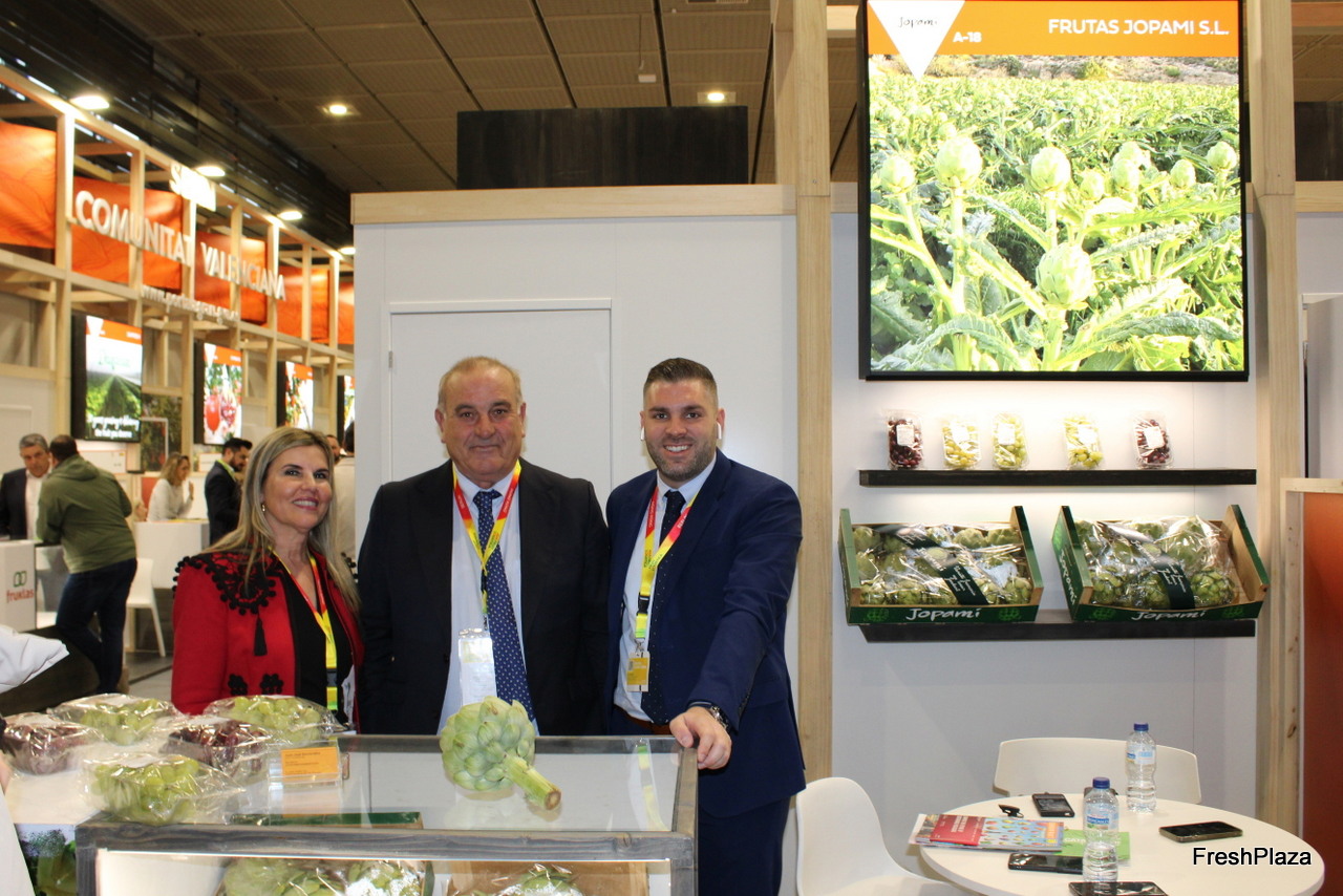 Frutas Jopami expuso en su stand alcachofas de tamaños espectaculares cosechadas de los campos españoles, que atrajeron la atención de los visitantes. En la foto, Paloma Aguyó, José Francisco Ruiz y Juanjo García