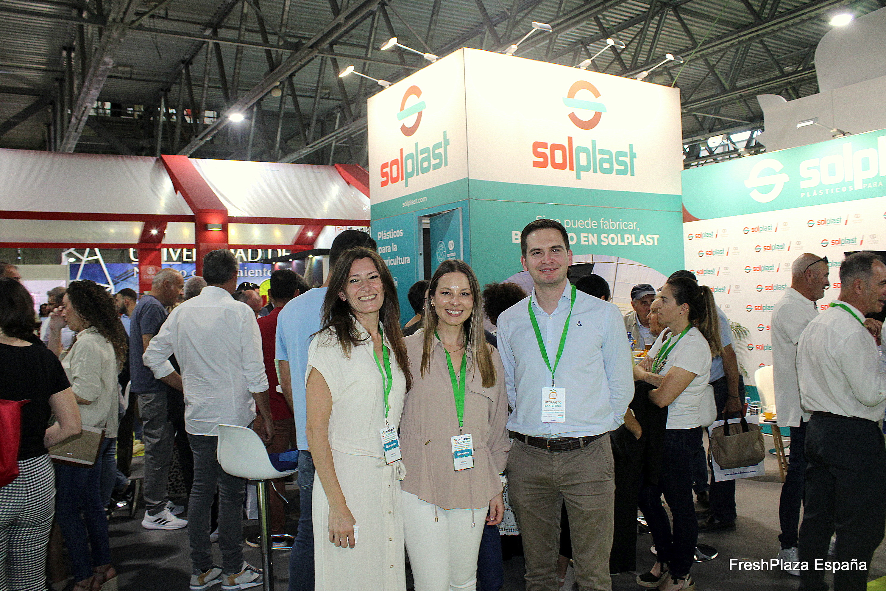 En el stand de Solplast, Lidia Silverio, Isabel Jiménez y Antonio Rodríguez