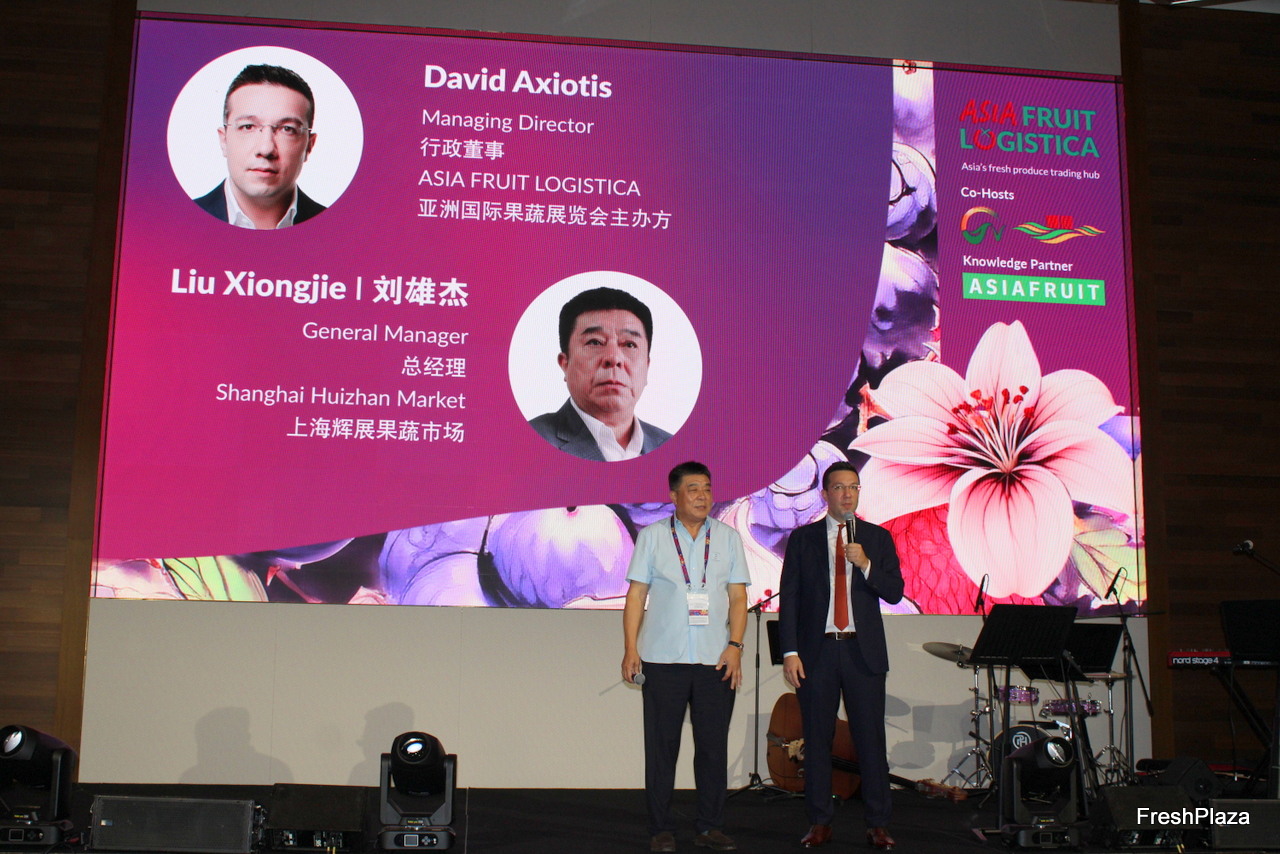 Liu Xiongjie, gerente general de Shanghai Huizhan Market, y David Axiotis, director general de Asia Fruit Logística, pronunciándose el inicio oficial del evento.