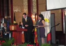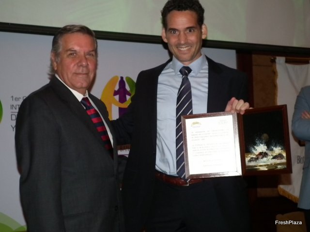 Vicente Wong de Favorita recibiendo Presea por parte de AEBE debido a su papel sobresaliente como empresario del sector bananero del Ecuador.