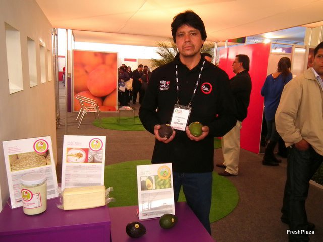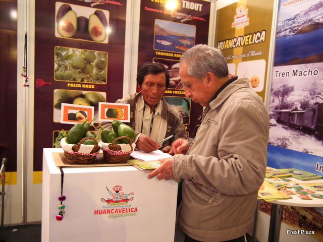 Productor de palta (aguacate) explicando sobre su oferta a un asistente a la feria.