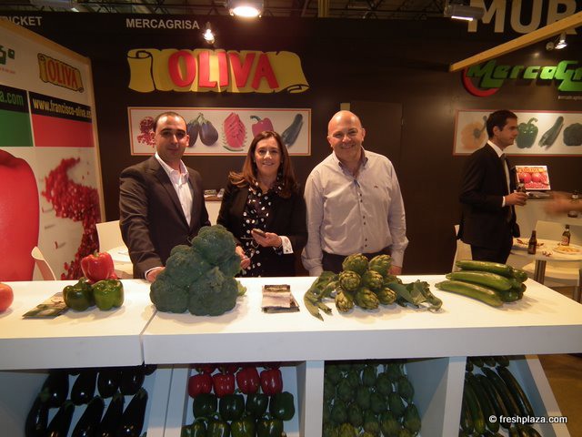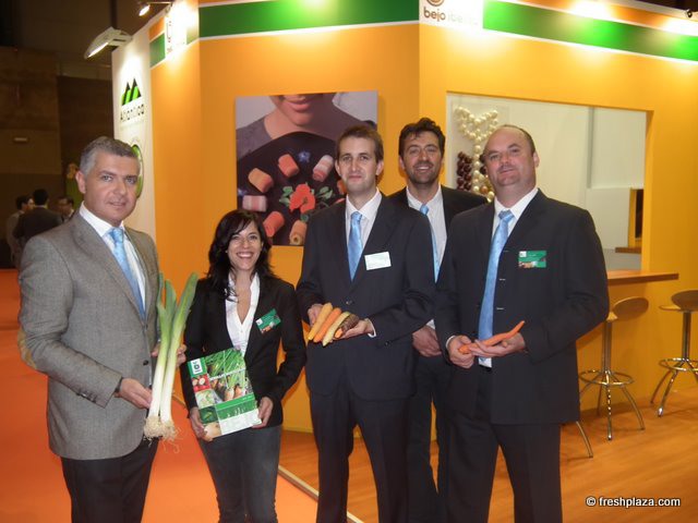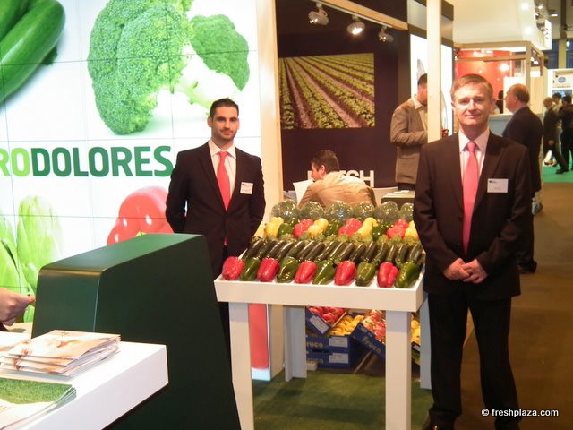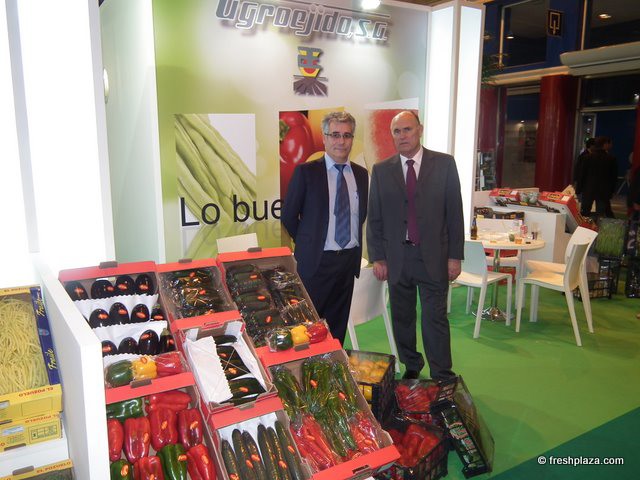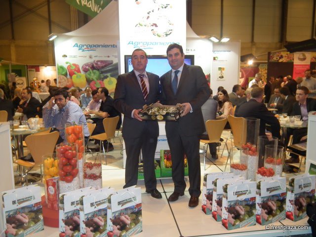 Antonio Román y José Miguel Fresneda de Agroponiente en el 25 aniversario de la empresa, promocionando sus hortalizas de Almería. Son positivos en su primer año en Fruit Attraction. La compañía ha alcanzado el 100% de la comercialización mediante control biológico.
