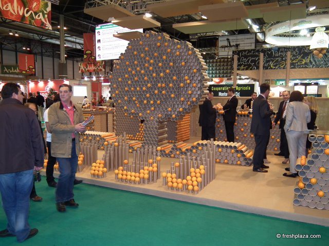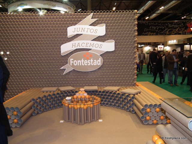 Original stand de Fontestad hecho con tubos de cartón y naranjas.