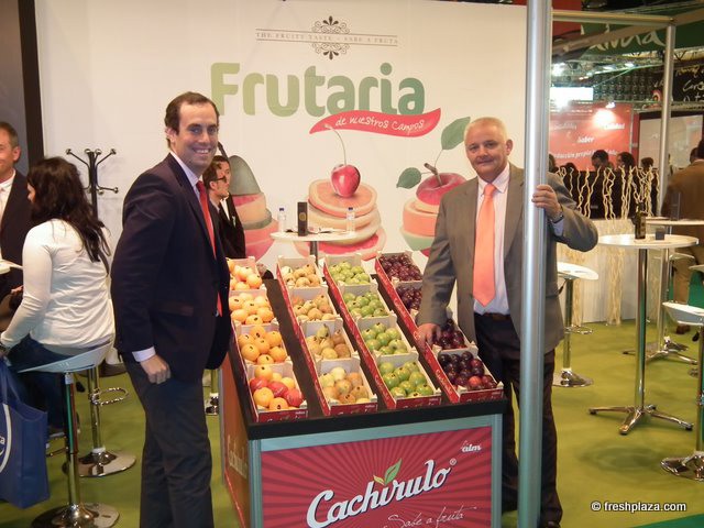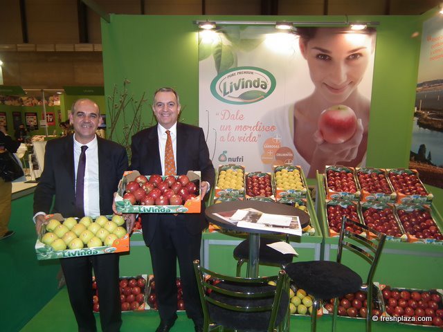 Alberto Bosch y Carlos Rodriguez, de Nufri, promocionando las dos variedades de manzanas de la marca Livinda. Después de una gran inversión esperan triplicar la producción de estas manzanas en dos años.