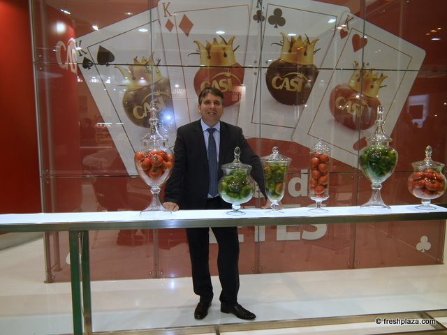 "El presidente de CASI, José María Andújar, mostrando sus mejores cartas: "El Póker de Reyes". Casi llegó a 225 millones de kilos de tomates en el ejercicio 2011-2012."