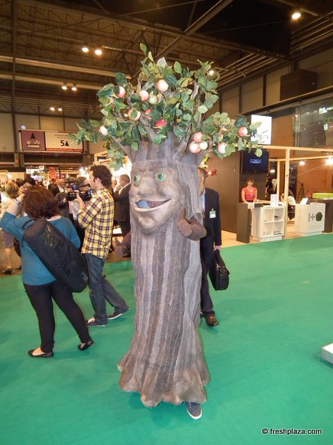 El árbol viviente cargado de manzanas de MARLENE estuvo paseando entre la multitud.