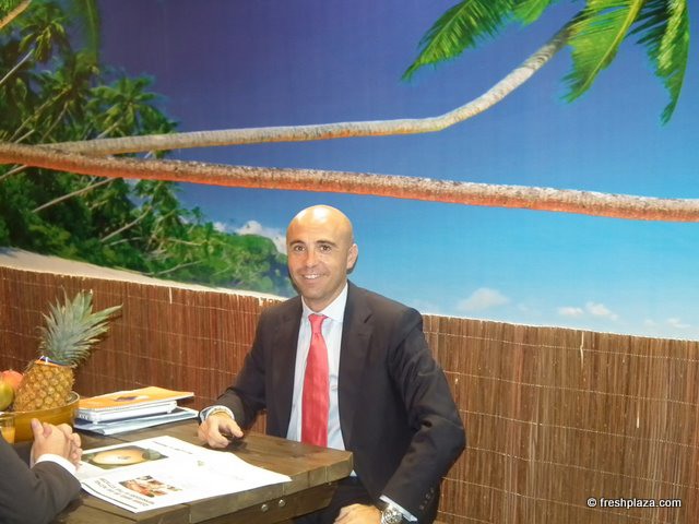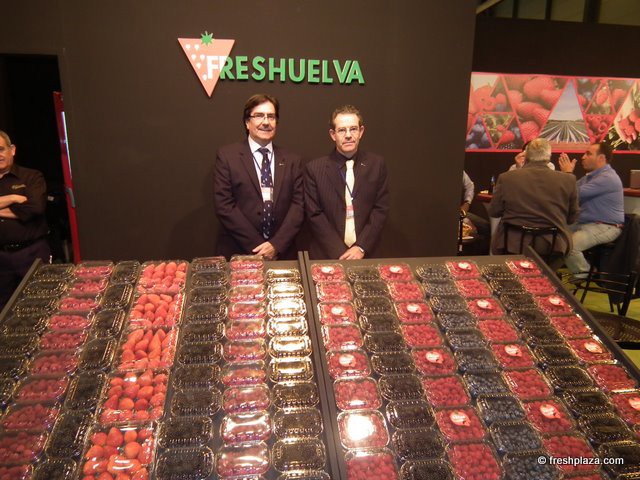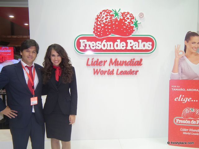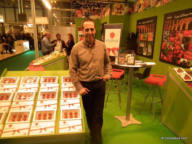 Luís Hernández, de Fresón de Palos, promocionando su marca de calidad de fresas de Huelva. Es uno de los expositores más visitados de la feria, gracias a sus presentaciones audiovisuales, catas de productos y el excelente servicio al cliente proporcionado por su personal.