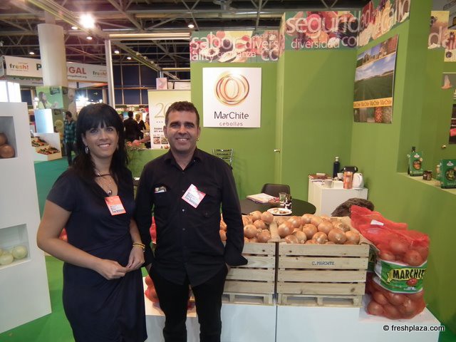 Beatriz Marchite y Eloy Hernández, de Cebollas Marchite, promocionando sus tres tipos de cebollas: Reca, Medio Grano y la cebolla Pelada, que ya exportan a numerosos países.