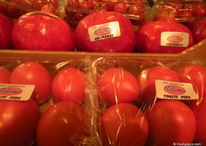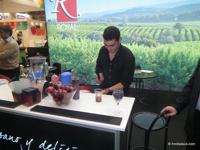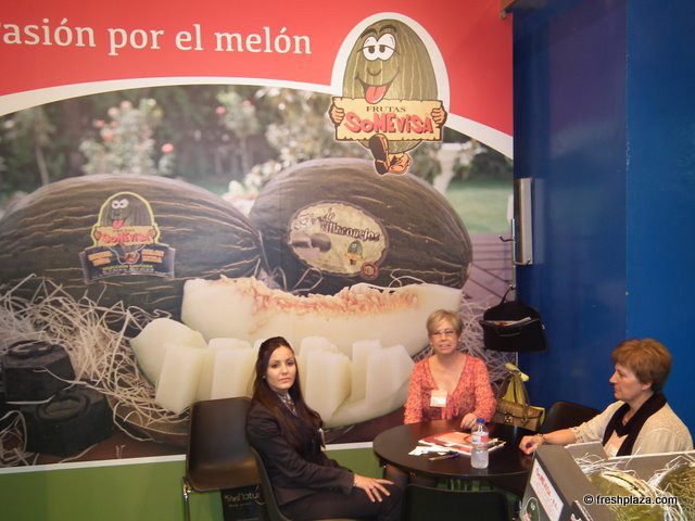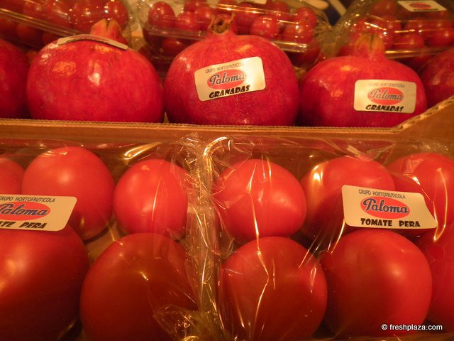 Stand del Grupo Paloma con Paloma Herández, promocionando sus tomates, uvas y granadas que desarrollan desde el nacimiento de la planta en sus propios viveros.
