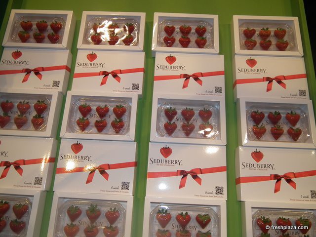 El Sr Muñoz Pascual, del grupo Intercom, promocionando las sorprendentes fresas SEDUBERRY con forma de corazón.