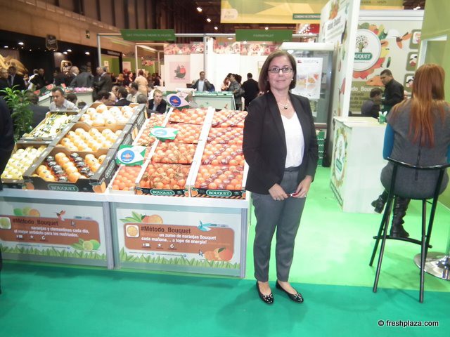 Carlota Pardo, responsable de comunicación de Anecoop, promocionando el Método Bouquet, la nueva línea de fruta pelada y cortada CLIMK y la nueva variedad de clementina CLEMNSOON.