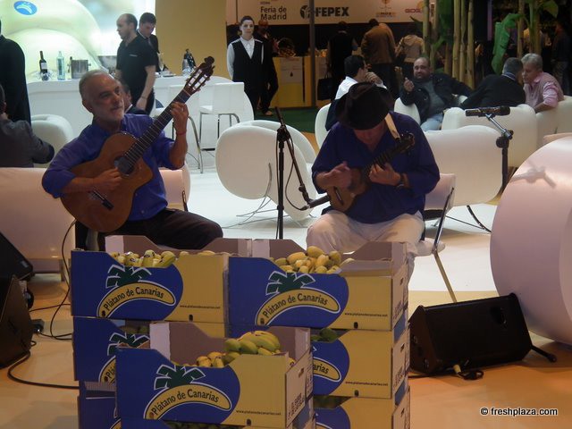 Músicos tocando en vivo en el Stand de Plátano de Canarias. La música canaria de estos artistas amenizó tanto el stand como el pabellón 1.
