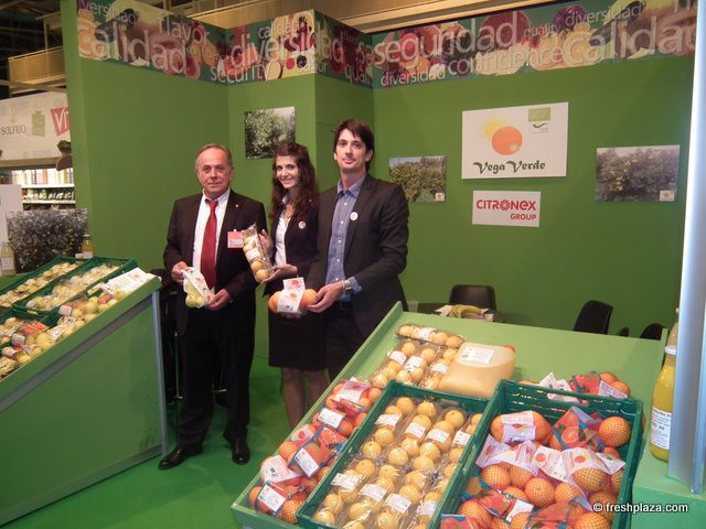 Francisco Espinosa padre e hijo junto a Ariadna de Los Reyes, mostrando toda la gama de cítricos y zumo de naranja orgánico.