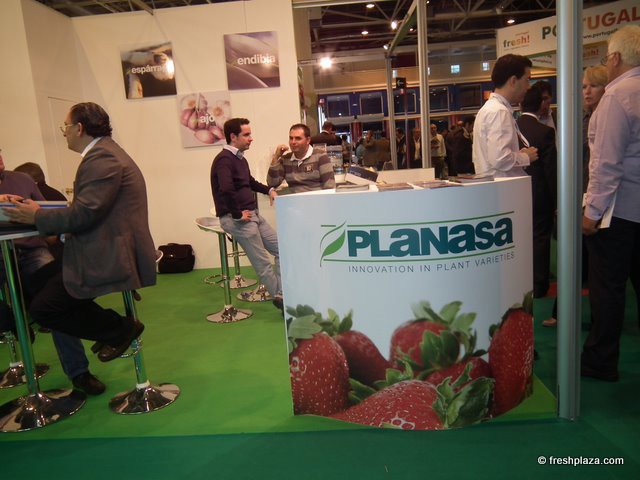 Stand de Planasa, promocionando sus nuevas variedades de plantas para frambuesa y ajos.