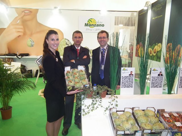 María Núñez, Bruno Crabé y José Tomás Abia, de Frutas Manzano, mostrando su especialidad: los chirimoyos, los cuales suministran en 3 calibres diferentes.