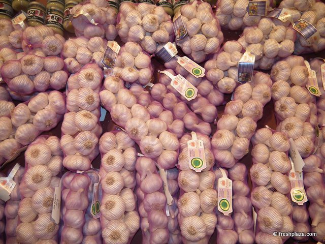 Ajos morados de las Pedroñeras en mallas y con el distintivo de denominación de origen, en el stand de IGP AJO MORADO DE LAS PEDROÑERAS.