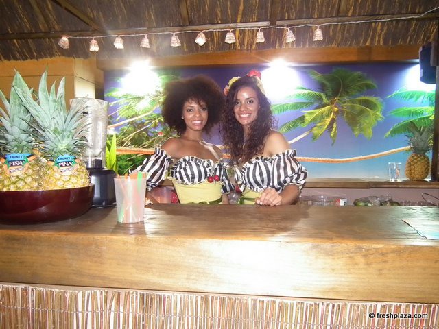 Estas dos chicas estuvieron sirviendo zumo de piña y piña colada en el stand de FRUNET, decorado al estilo HAWAY.