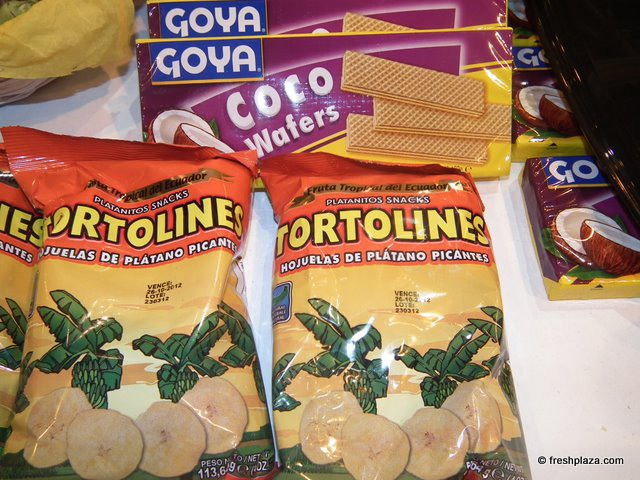"Galletas de vainilla y coco "COCO Wafers" y "Tortillones", rodajas fritas de plátano macho con un toque picante."
