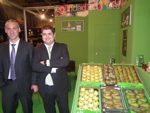 Carlos San Adrián y Juan Miguel Artazcoz, del Grupo AN, promocionado sus manzanas y peras frescas de Navarra y del Valle del Ebro