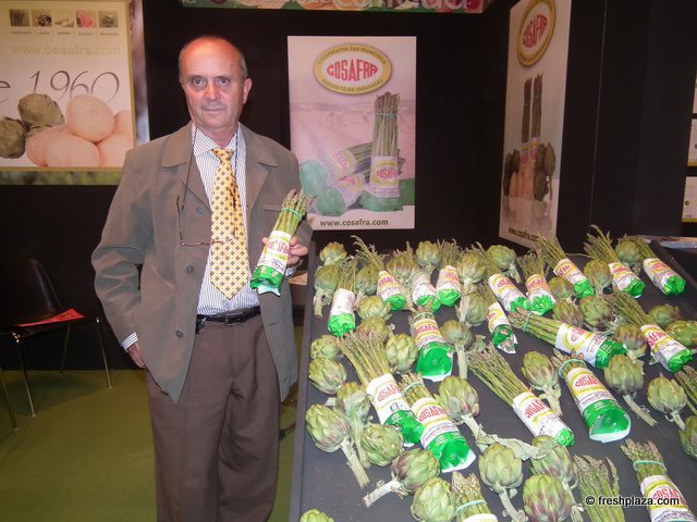 Benito Martín Lizana, presidente de COSAFRA, Cooperativa Agrícola San Franciso, mostrando las alcachofas y espárragos trigueros andaluces.