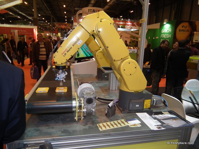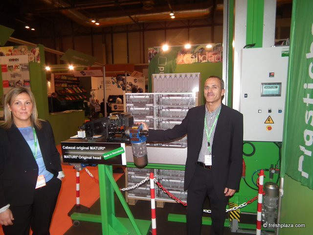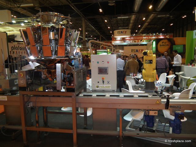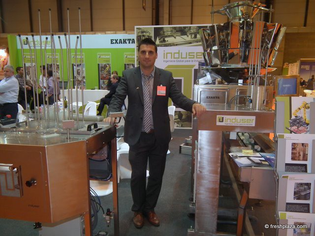 Pedro Martínez Lázaro, de INDUSER, mostrando dos de las nuevas máquinas para envasado de frutas y hortalizas frescas. INDUSER suministra la robótica y se asocia con EXAKTA, quien proporciona los sistemas informáticos.