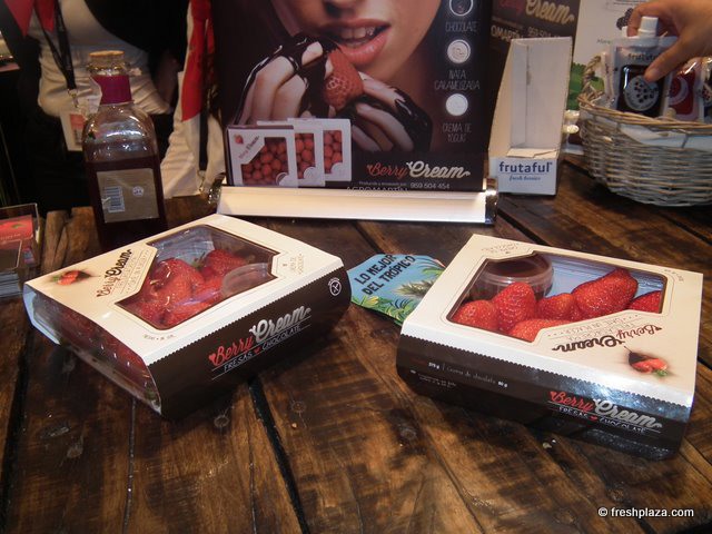"Nuevos envases Berry Cream con fresas frescas selectas y una tarrina de chocolate fundido para bañar las fresas a modo de "foundat". Además, también presenta una ueva variedad de berries triturados envasados sin conservantes ni aditivos."
