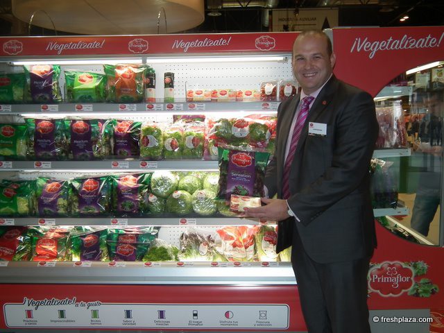 Jordi Estrada, de Primaflor, mostrando todas sus variedades de lechuga cortadas y lavadas en paquetes con la marca Primaflor.