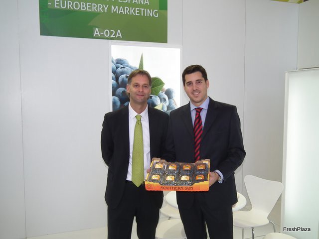 Stand de Euroberry, de Sevilla, con Thomas y Alberto Jiménez Capitán, promocionando la nueva campaña española de arándanos con las marcas Southern Sun y Berry Touch.