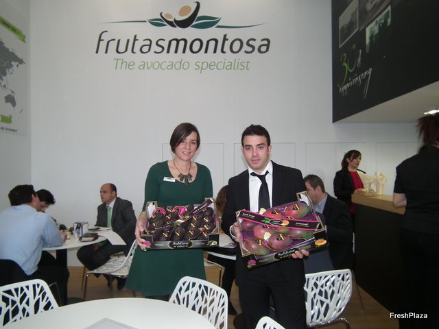 Lucía Polo y Federico Montosa en su stand de Frutas Montosa, de Vélez-Málaga, presentando sus aguacates Hass y mangos españoles. También expusieron su propio guacamole con un 95% de aguacate, sin conservante ni colorantes añadidos, gracias a un sistema de alta presión utilizado para su envasado.