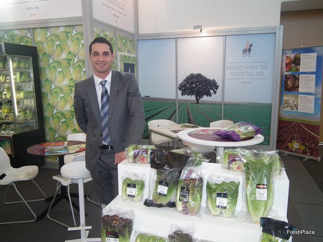 Miguel Sanmartín en su stand de Murciana de Vegetales, promocionando todas las variedades de lechuga que producen en la huerta de Murcia.