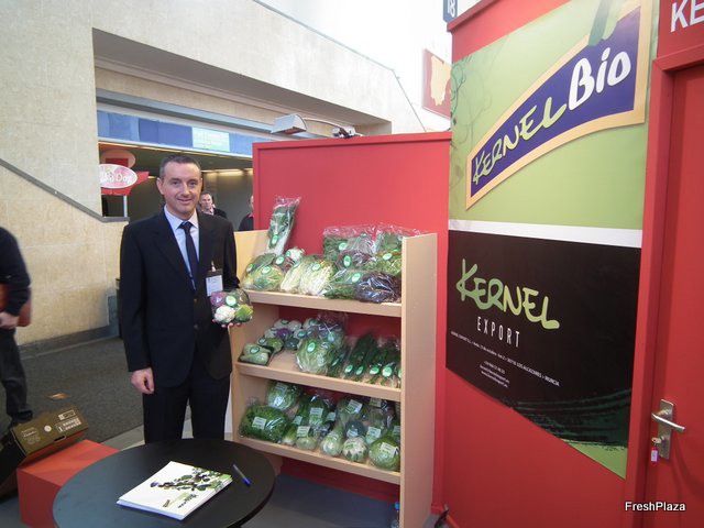 Ian Claydon en su stand de Kernel Export S.L., promocionando su marca de productos ecológicos y su especialidad, las miniverduras. En la foto nos muestra el pack de coliflores baby.