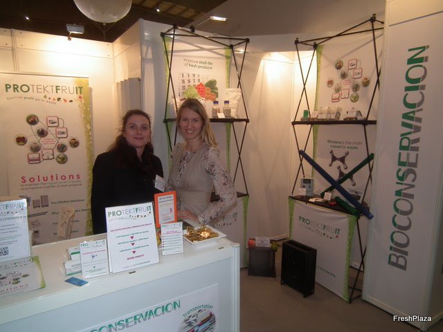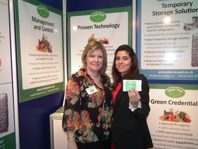Stand de Fresh Pod, del Reino unido, con Rocío Jiménez (izquierda), responsable de relaciones comerciales en España, junto a su compañera. Fresh Pod es un novedoso producto eficaz en la absorción de gas etileno en frutas y verduras.
