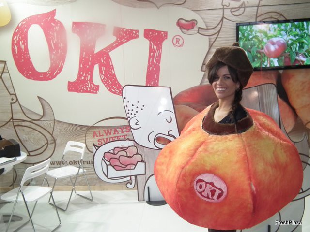 Este simpático paraguayo marca OKI invitó a los visitantes a conocer las ventajas de la fruta de hueso de Lleida en su stand de OKI.