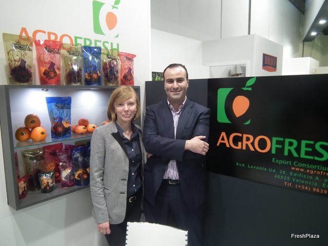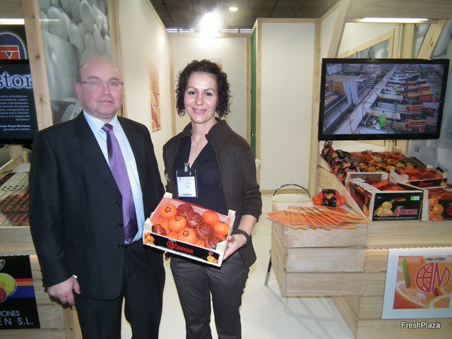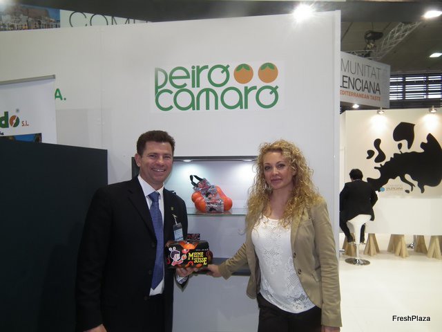 Carolina Santamaría y Alejandro Peiró Camaró, Director Comercial de Peiró Camaró, promocionando en su stand los cítricos valencianos en plena temporada.