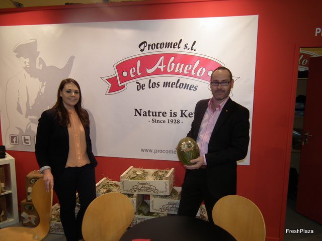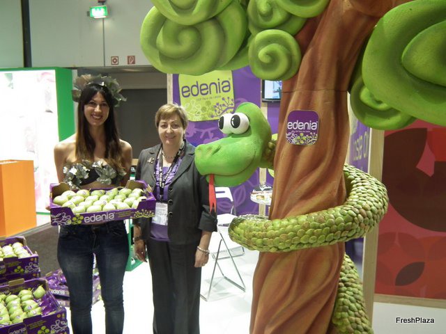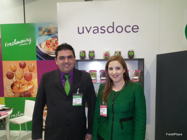 Alfredo Miralles, gerente de Uvasdoce y su Directora Comercial Estrella Miralles en el stand de Uvasdoce, promocionando las uvas envasadas sin semillas de Alicante.