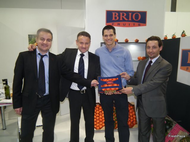 Equipo directivo de Agrios Selectos S.L.(Brio Fruits), de Real de Gandía, promocionando las clementinas Fina y las naranjas Sanguinelli.