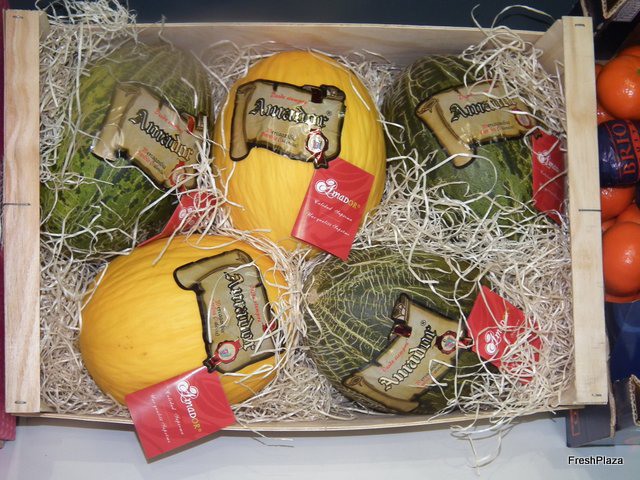 Melones Piel de Sapo y Amarillo de Amador, en el stand de Brio Fruits.