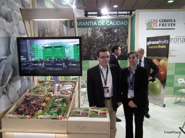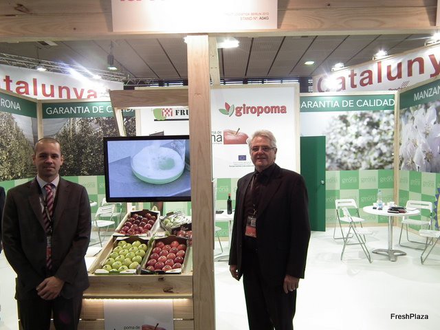 Fidel Lllorens y Roca, en el stand de Girona Fruits, promocionando las manzanas de la provincia catalana de Girona
