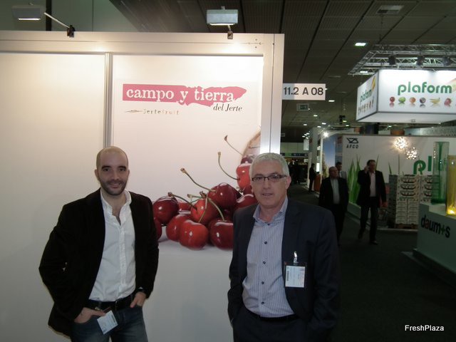 Jorge Calero, Comercial de Campo y Tierra del Jerte, y Domingo Fraile, presidente de la empresa de Cáceres, Extremadura, promocionando la futura campaña de cerezas y a punto de empezar con la campaña de espárragos Bio.