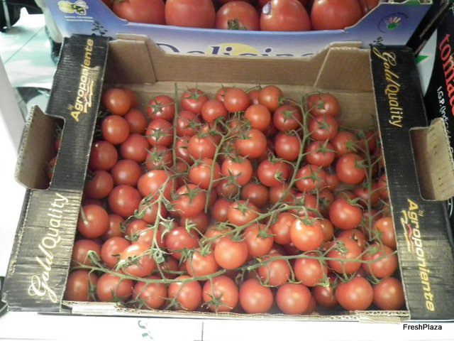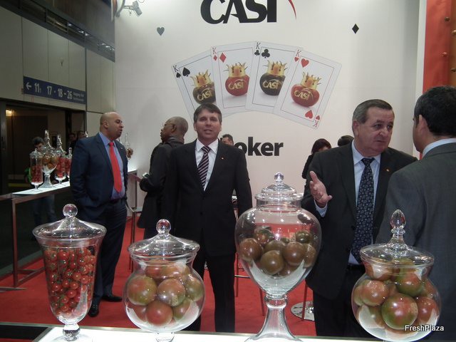 "José María Andújar (en el centro)promocionando la campaña "Póker de Reyes" y los tomate Cherry y Cocktail en el siempre transitado stand de CASI, principal productor y eportador de tomates de Europa."