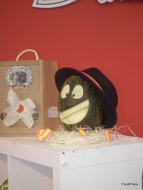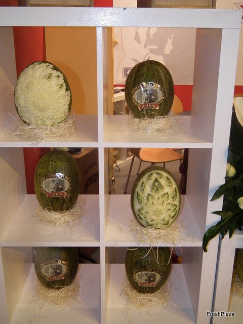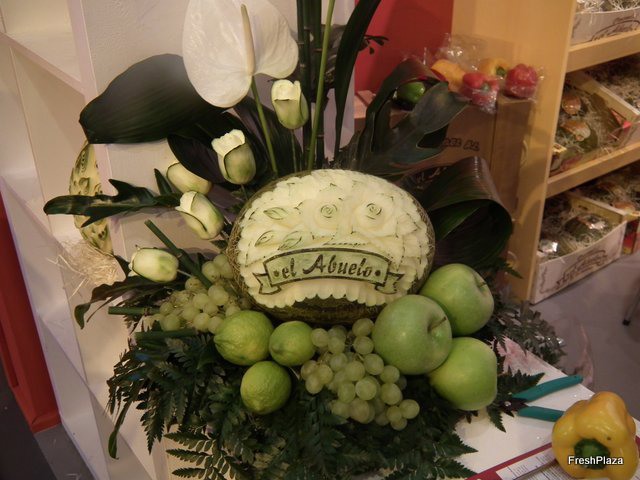 Magnificasn figuras esculpidas en un melón Piel de Sapo expuesto en el stand de Procomel S.L. El Abuelo de los melones, empresa murciana productora y exportadora de melones